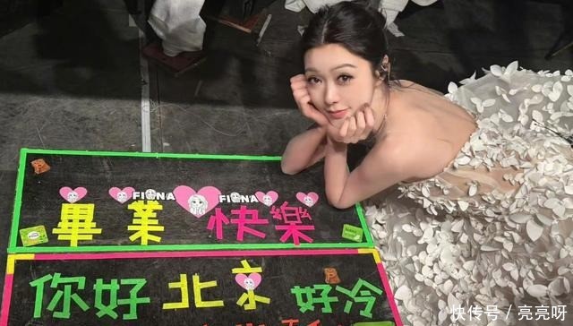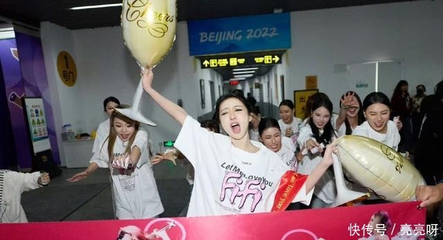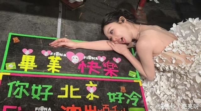 整个人就像花仙子一样,地上用彩色的贴条贴着:你好北京,演出顺利,收官快乐的字样,她整个人双手托腮,仰头看镜头,显得乖巧可爱。